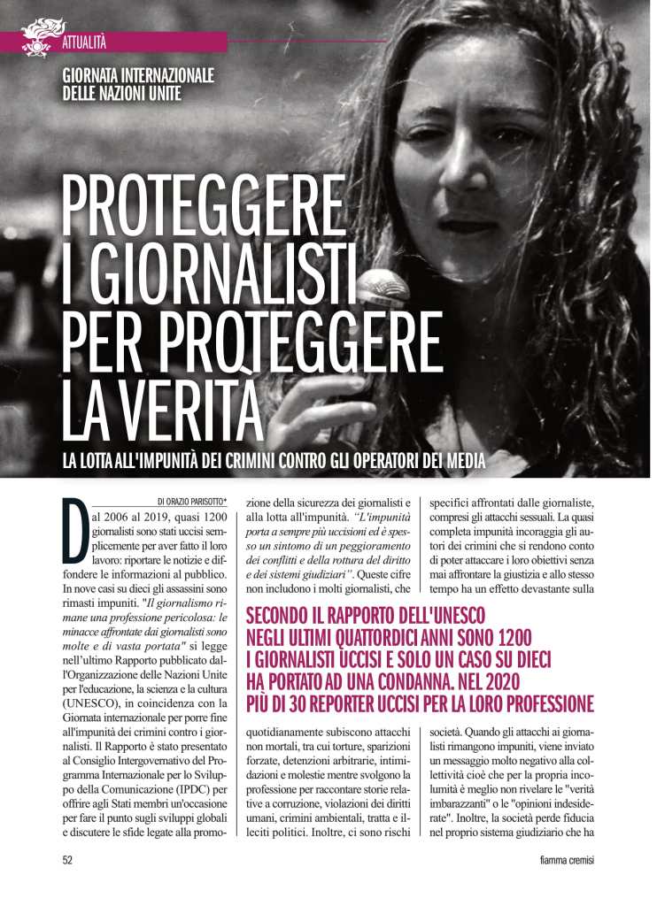 Secondo il Rapporto dell’Unesco negli ultimi quattordici anni sono 1200 i giornalisti uccisi semplicemente per aver fatto il loro lavoro: riportare le notizie e diffondere le informazioni al pubblico. E solo un caso su dieci ha portato ad una condanna. Di questa preoccupante condizione in cui si trovano ad operare i media nel mondo e più in generale della necessità di difendere sempre e ovunque la libertà di stampa, ne parlo nell’articolo che ho pubblicato sul numero di dicembre appena uscito di “Fiamma Cremisi” la Rivista dell’Associazione Nazionale Bersaglieri richiamando le dichiarazioni del Segretario Generale delle Nazioni Unite Antonio Guterres e del Direttore Generale dell’UNESCO Audrey Azoulay in coincidenza con la Giornata internazionale per porre fine all’impunità dei crimini contro i giornalisti.