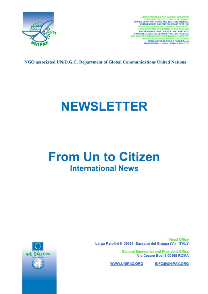 Con questo numero speciale riprendono le pubblicazioni della Newsletter Unipax From Un to Citizen – International News che erano state sospese a causa della pandemia Covid. Nell’occasione auguriamo un Felice Anno Nuovo a tutti i lettori.