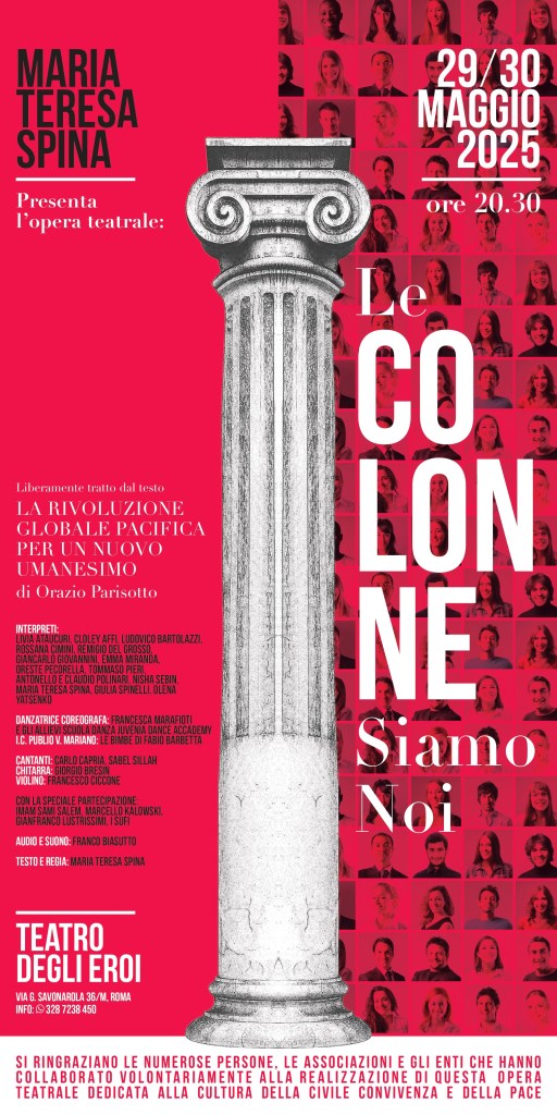 E’ in fase di allestimento la riedizione dello spettacolo teatrale “LE COLONNE SIAMO NOI”. Testo e regia sono di Maria Teresa Spina. Si tratta di un lavoro liberamente ispirato al saggio del Fondatore e Presidente di UNIPAX Orazio Parisotto “La rivoluzione globale pacifica per un nuovo umanesimo”. Sono previste due rappresentazioni, a Roma al Teatro degli Eroi il 29 e il 30 maggio, in concomitanza con le celebrazioni dei 40 anni dalla nascita di Unipax. E’ già possibile prenotare il posto scrivendo a press@unipax.org Il costo del biglietto è di 10 euro. Il pagamento può essere effettuato presso il botteghino del teatro in via Girolamo Savonarola 36/M la sera stessa scelta per partecipare allo spettacolo.
