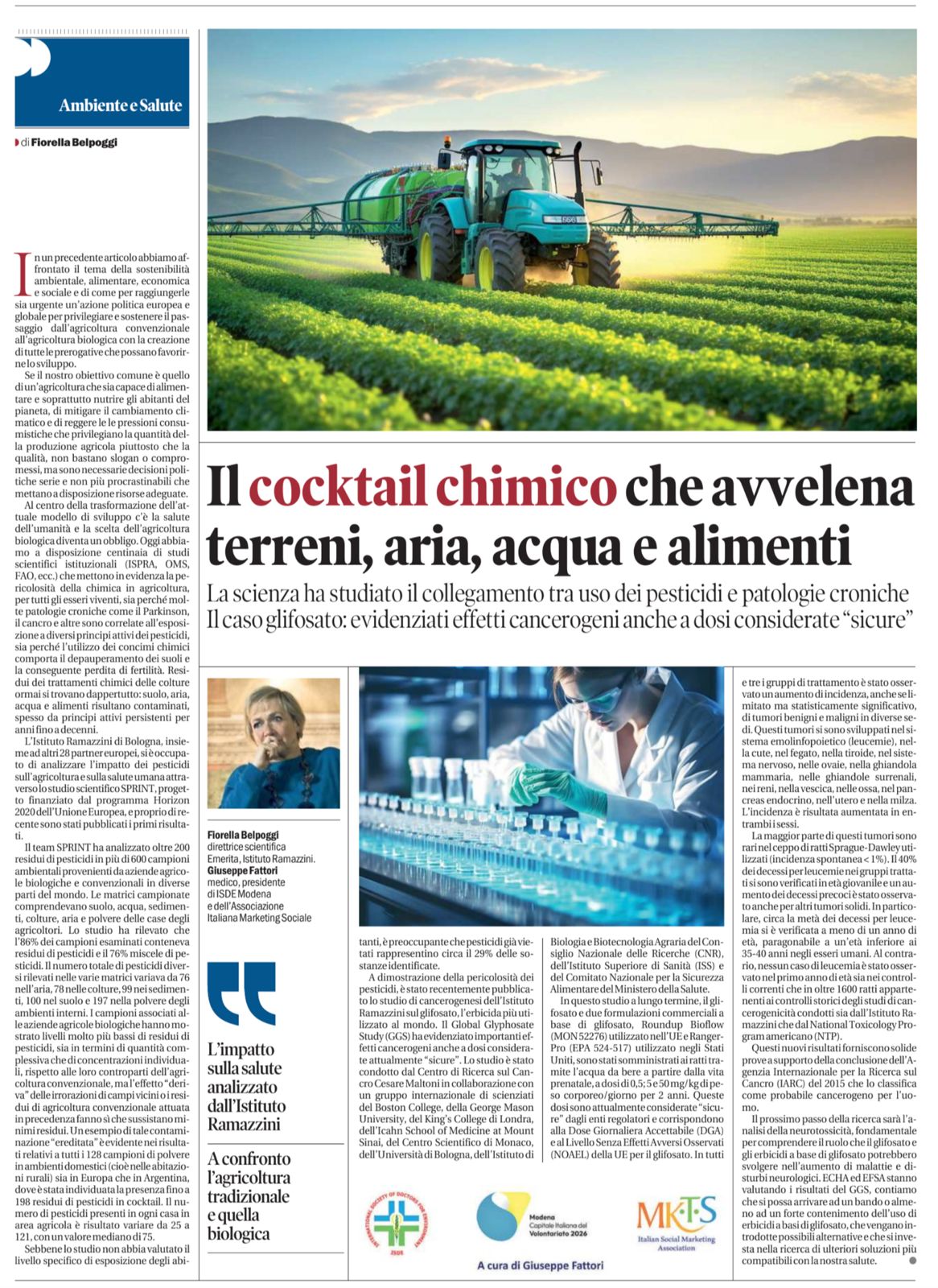 In questo articolo, pubblicato su La Gazzetta di Modena, La Nuova Ferrara e la Gazzetta di Reggio Emilia, la Dott.ssa Fiorella Belpoggi, Direttrice Scientifica Emerita dell’Istituto Ramazzini e Consigliere del Comitato Promotore di United Peacers, denuncia il grave pericolo costituito da un vero e proprio “cocktail chimico” che avvelena terreni, aria, acqua e alimenti, dimostrando il collegamento tra uso dei pesticidi e patologie croniche, con particolare riferimento all’utilizzo del glifosato per il quale sono stati evidenziati effetti cancerogeni anche a dosi considerate “sicure”.